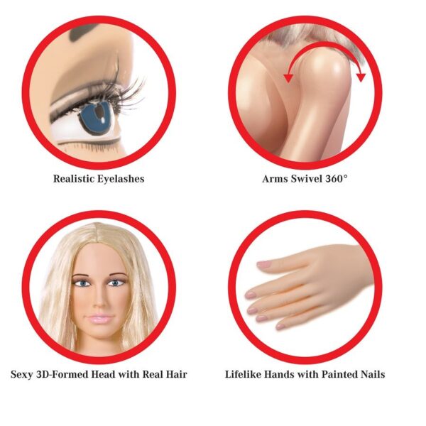 Esta increíble muñeca de tamaño natural inflable, fue meticulosamente diseñada con características realistas para una experiencia verdaderamente realista. Su atractivo rostro 3-D moldeado, se remata con una lujosa cabellera que está deseando ser retirada. Con sus pechos turgentes podrás disfrutar de sus pezones super suaves y reales. Su vagina y culo apretado y muy realista